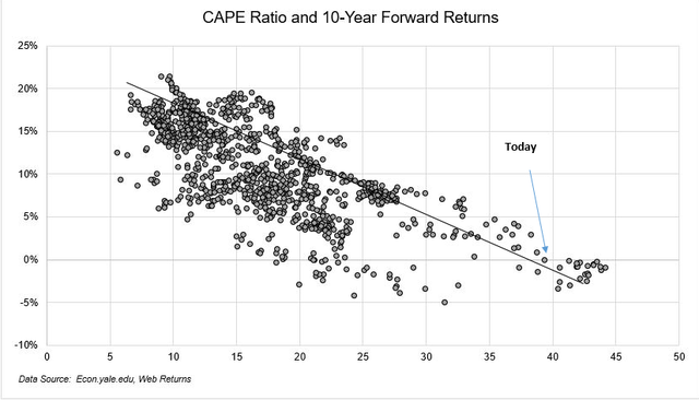 The CAPE Ratio is a popular one as it attempts to normalize P/E ratios over a business cycle. The correlation between buying at certain CAPE levels and subsequent 10-year returns is very high as evident that the dots are clumped together along a tight fit regression line. Obviously, low valuations tend to have higher subsequent returns and higher valuations lead to lower returns. Using today's metric of 37x, the 10-year return is likely to be closer to +1% per year.