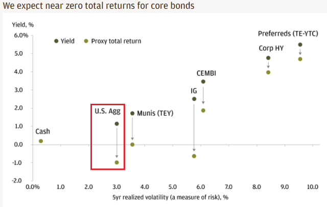 JP Morgan expects total returns for traditional bond portfolios to be close to zero. That is because the yield is so low that even a small uptick in interest rates will erase all the income gains and cause your yield to be wiped out by losses in values.
