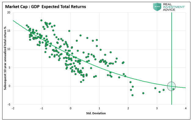 The following is the valuation measure that Warren Buffett tends to cite often. It is the market cap of global equities compared to GDP or the size of the economy. Today, that ratio is approximately 1.5x which is more than twice the historical average. If you follow the circle horizontally along the x-axis you can see it hits the y-axis right at zero implying 10-year annualized returns of nothing. No returns for ten years!