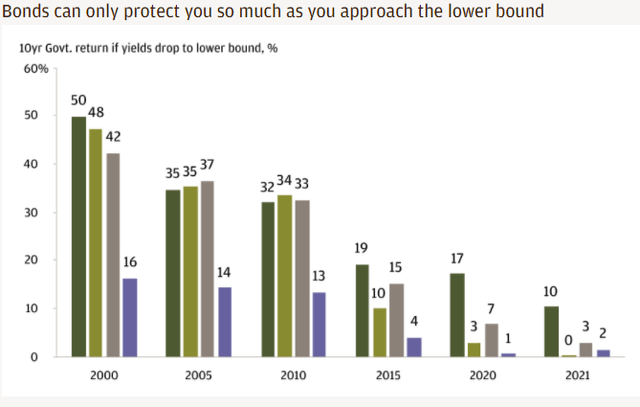 The downside protection is also minimal thanks to being so close to the zero-bound. Remember, bond prices and yields move in opposite directions. That means when the economy and stock market take a hit, interest rates fall, and bond prices rise. The increase in bond prices will push up your bond values offsetting some of the losses being experienced on the equity side. This is the downside buffer.