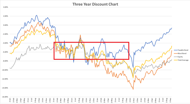 The discount chart tells it all. You can see the absolute tear that CEFs have been on for the last nearly year. Taxables have been moving hard all year and never really saw the same level of widening that equities and muni CEFs did (the red box above). Thus, they started from the a higher level when the rally began.